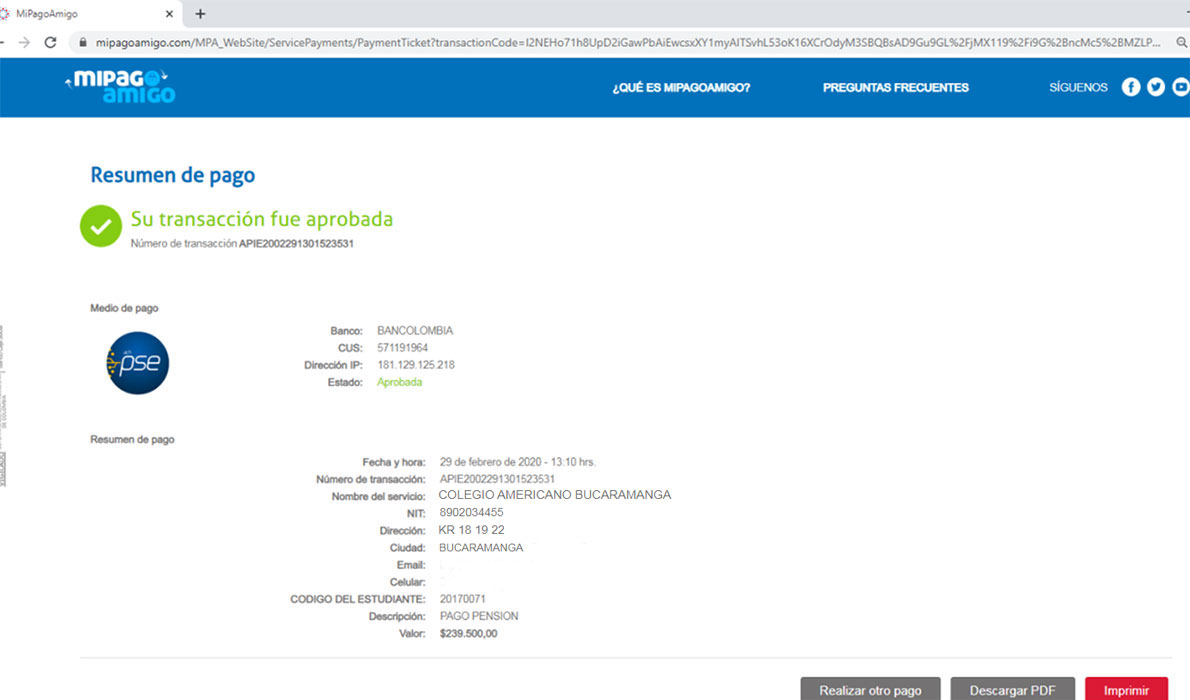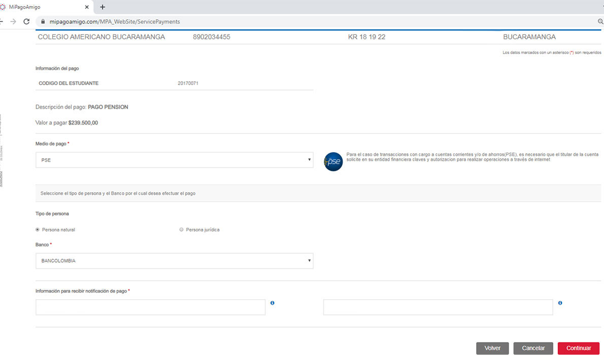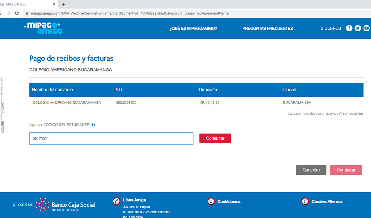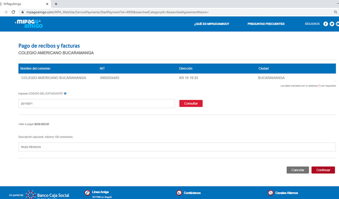 PASO 3. Si el Código digitado es válido, el sistema deplegará el valor a pagar como se muestra en la imagen. Si el valor es correcto presione el botón Continuar, en caso contrario abandone el pago y comuniquese con el colegio.