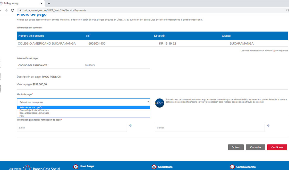 PASO 4. El Sistema desplegará los medios de pago disponibles, si usted tiene una cuenta bancaria en el Banco Caja Social deberá elegir Banco Caja Social - Personas o Banco Caja Social - Empresas según su tipo de cuenta, si su cuenta pertenece a otro banco entonces deberá elegir la opción PSE, podrá registrar Email y Celular para recibir confirmación del pago, finalmente debe presionar el botón Continuar.