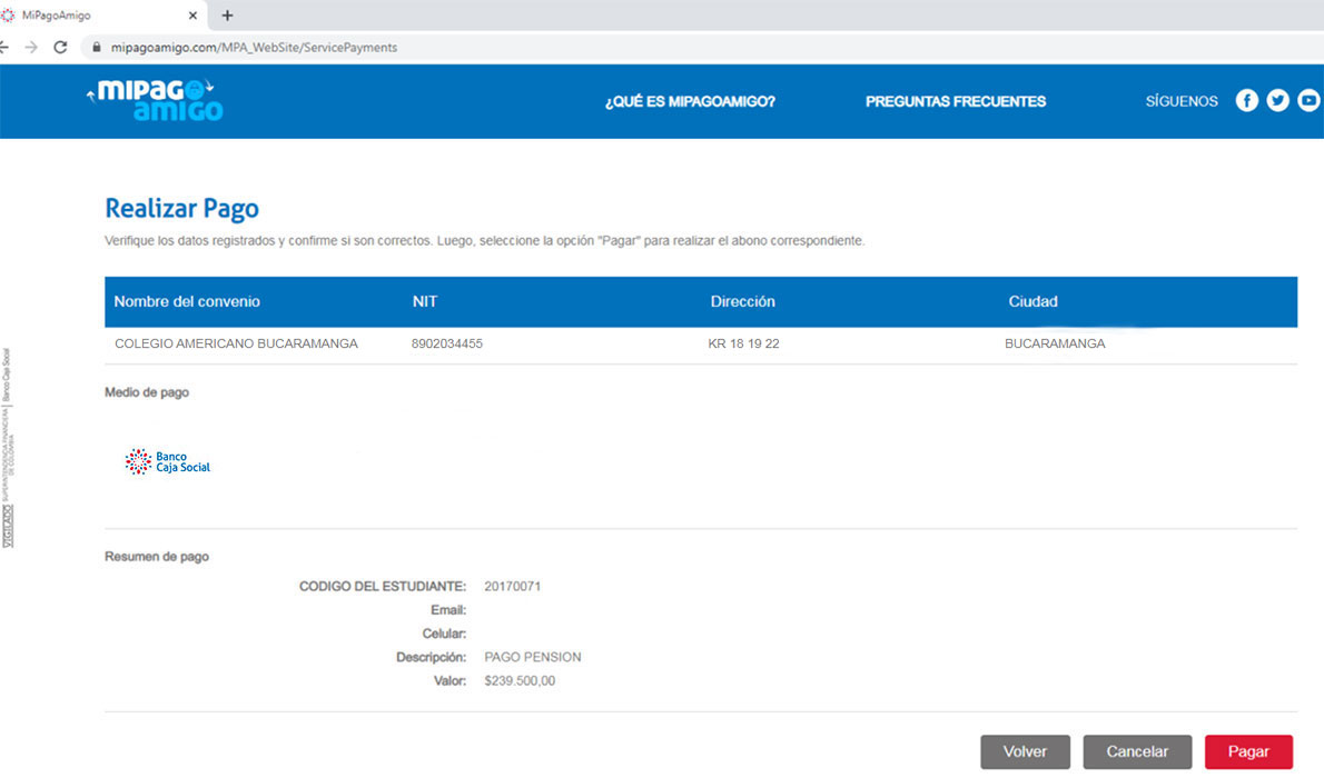 PASO 5. Si en el Paso 3 eligió Banco Caja Social - Personas o Banco Caja Social - Empresas, el Sistema desplegará la pantalla del pago por el Banco Caja Social y allí debe presionar el botón PAGAR.