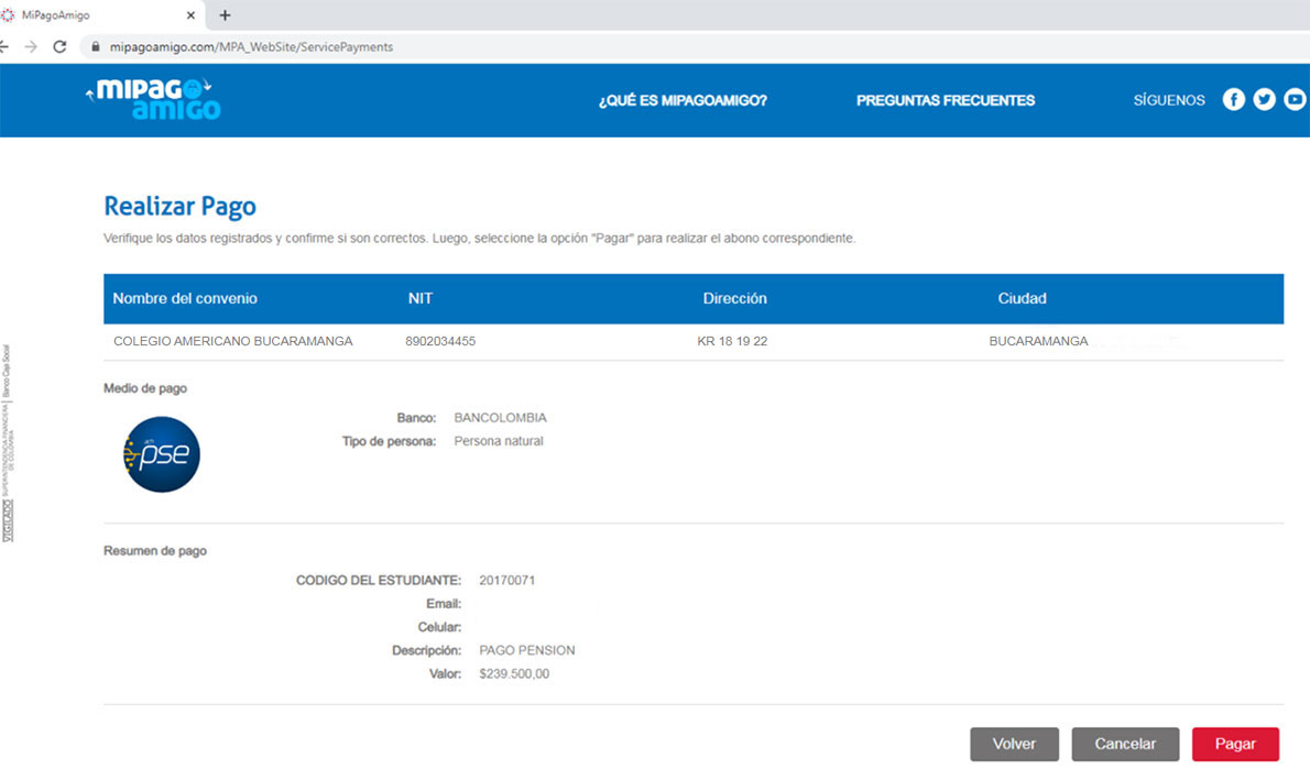 PASO 6. Si va a realizar el pago por PSE, el Sistema desplegará la pantalla de pago en la cual debe revisar los datos registrados y luego presionar el botón PAGAR.