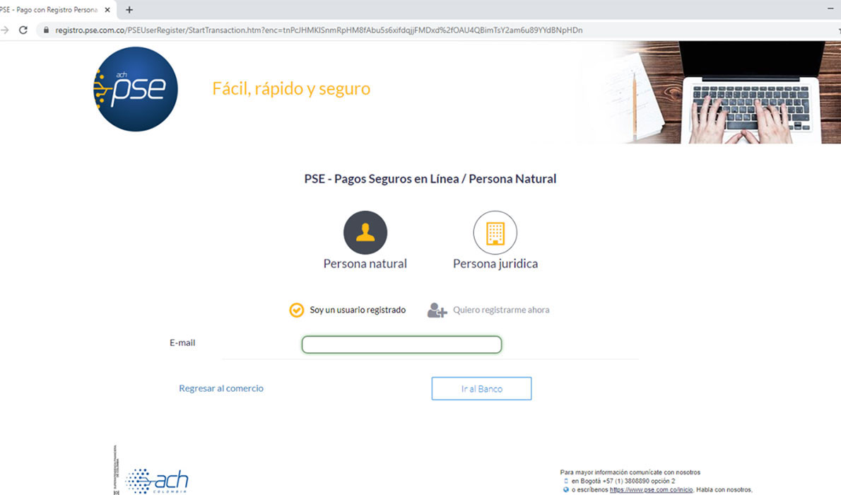 PASO 5-B. Si en el Paso 3 eligió PSE, el Sistema desplegará la pantalla que se muestra en la siguiente imagen, allí debe elegir el Tipo de Persona, Banco, digitar su Email, Celular y presionar el Botón CONTINUAR.
